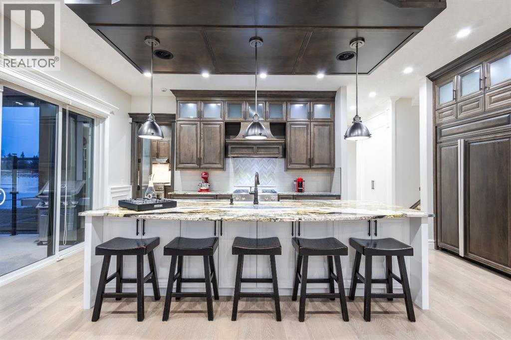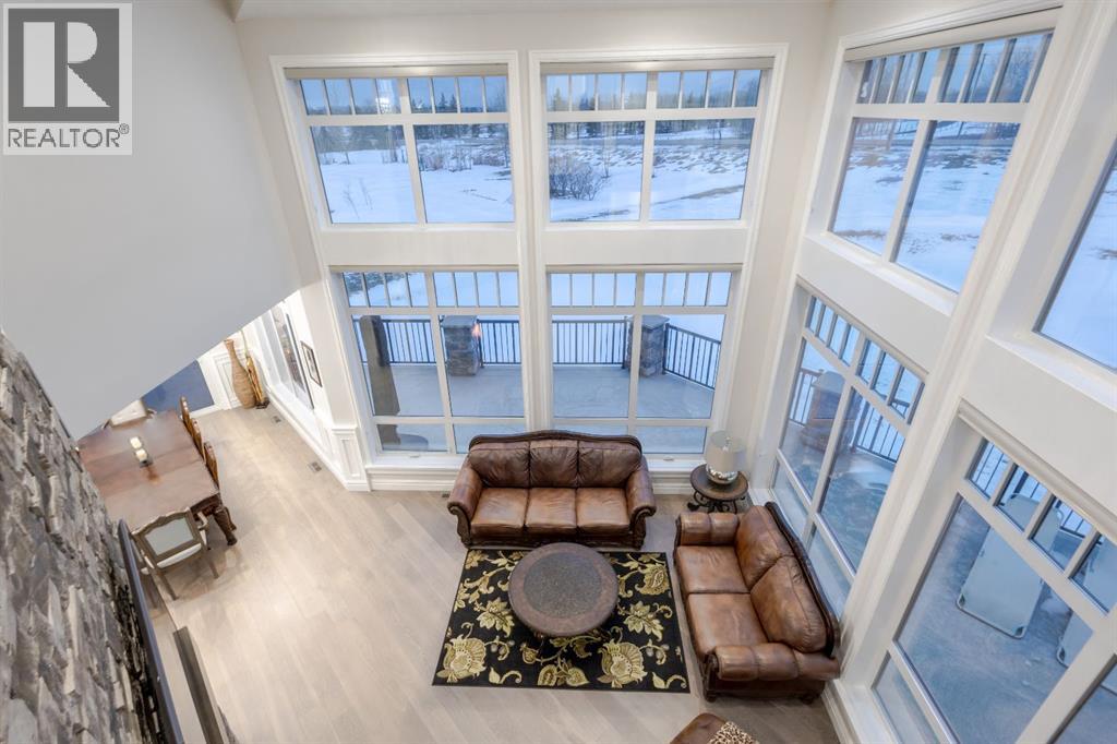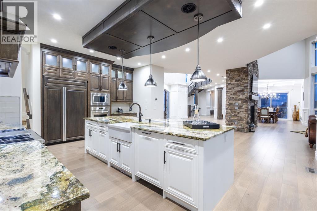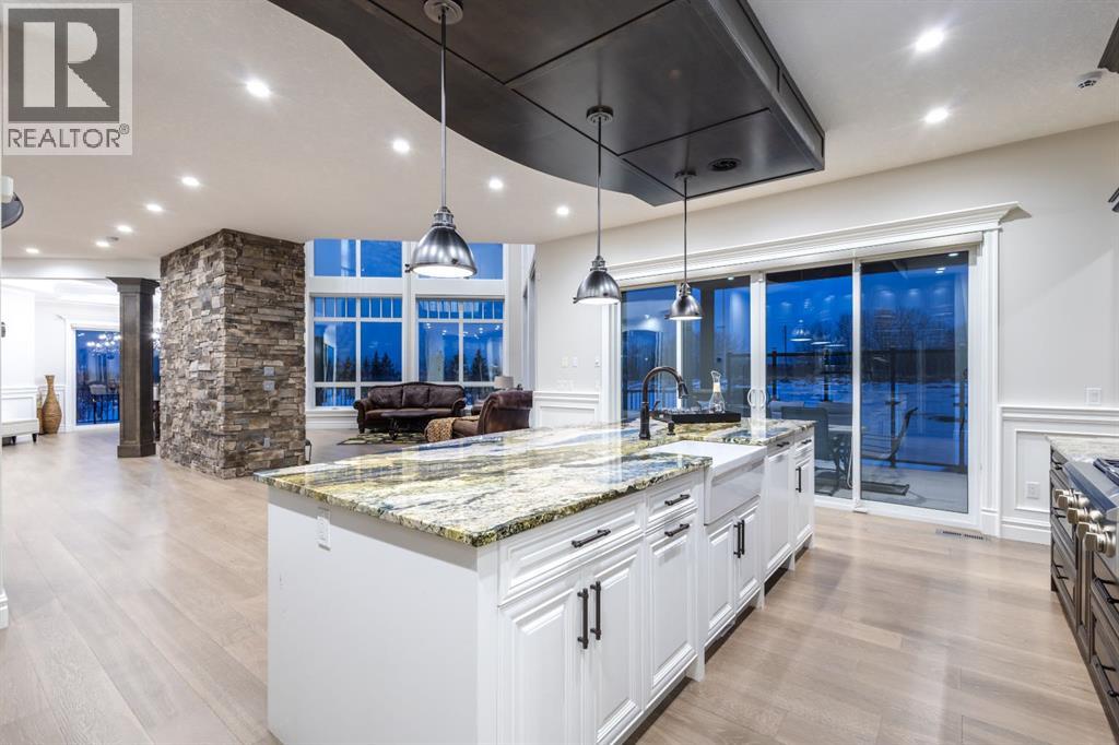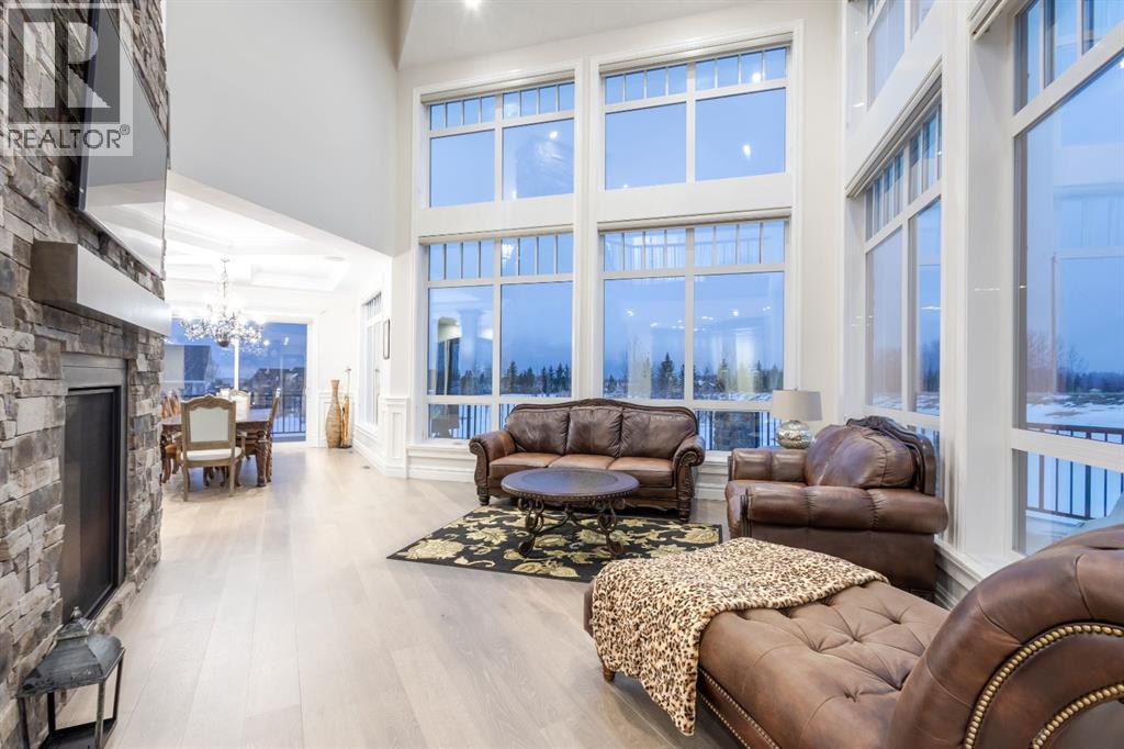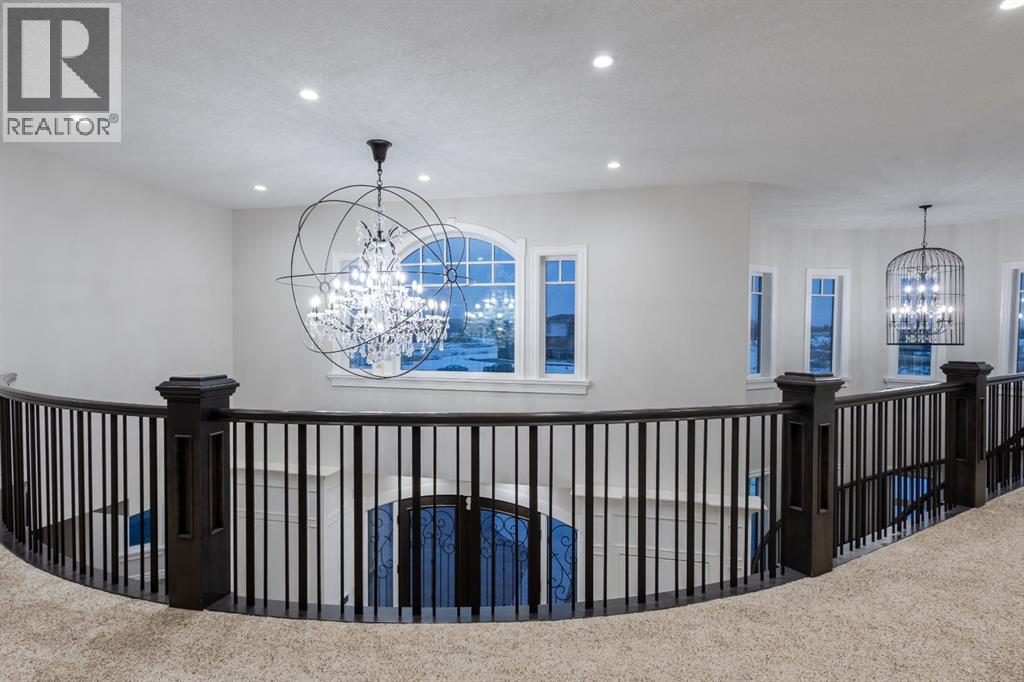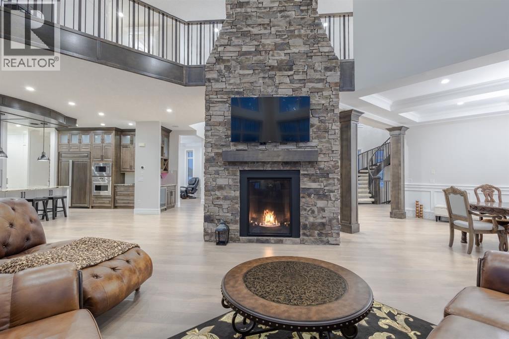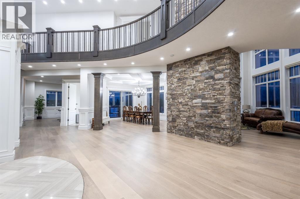 Located on two acres in the heart of prestigious Bearspaw, this exceptional custom-built estate offers over 7,000 square feet of refined living space, blending timeless elegance with modern luxury. From the moment you arrive, the grand entrance makes a lasting impression with soaring open-to-below ceilings, a breathtaking sense of scale, and stunning west-facing views that stretch toward the mountains. Expansive windows throughout the home flood the interior with natural light, enhancing the open-concept design and creating a seamless connection to the surrounding landscape. The chef-inspired kitchen is both beautiful and functional, featuring rich granite countertops, stainless steel appliances, generous bar seating, and a fully equipped spice kitchen—perfect for entertaining or everyday living. Thoughtful design continues with a convenient 2-piece bathroom on the main level. Just beyond, the living room is a true showpiece, anchored by a striking gas fireplace with stone surround and wooden mantel, while panoramic west and mountain views create an unforgettable backdrop. Step outside to the expansive west-facing wraparound deck, offering both covered and open-air spaces designed for relaxation and entertaining. With its private setting and sweeping mountain vistas, this outdoor retreat is truly one of a kind. Upstairs, the home continues to impress with an open-to-below design and a remarkable abundance of windows that showcase the incredible views. In addition to the primary retreat, there are four spacious bedrooms, two well-appointed bathrooms, and a thoughtfully designed laundry room complete with built-in cabinetry and a sink. A dedicated storage room adds even more practicality to this level. The primary suite is a luxurious sanctuary, featuring a double-sided gas fireplace, a spacious walk-in closet with custom built-ins, and a lavish 6-piece ensuite with a soaking tub, dual vanities, and premium finishes throughout. Step out onto your private balcony to ta ke in the mountain views, or enjoy the attached flex space—perfect as an art studio, lounge, or private retreat. The fully developed walkout basement is designed for both entertainment and wellness. Enjoy movie nights in the dedicated theatre area with built-in sound system, host gatherings at the wet bar with custom built-ins, or relax in the sauna after a workout in the home gym. This level also includes in-floor heating, two additional bedrooms, a 3-piece bathroom, and direct access to the backyard. Dual staircases provide convenient and elegant access throughout the home, while features such as a water softener enhance everyday comfort. Car enthusiasts and hobbyists will appreciate the impressive heated six-car garage with ample space for storage and projects. With its unparalleled craftsmanship, luxurious finishes, and breathtaking setting with views of the northern lights and just minutes from the city, this extraordinary Bearspaw estate offers a lifestyle of sophistication and natural beauty. (id:55577)